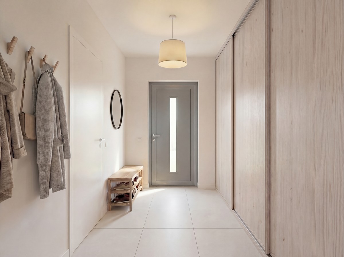Drzwi wejściowe Podstawowe drzwi zewnętrzne zawierają trzy zawiasy, pochwyt z stali nierdzewnej L=500 |